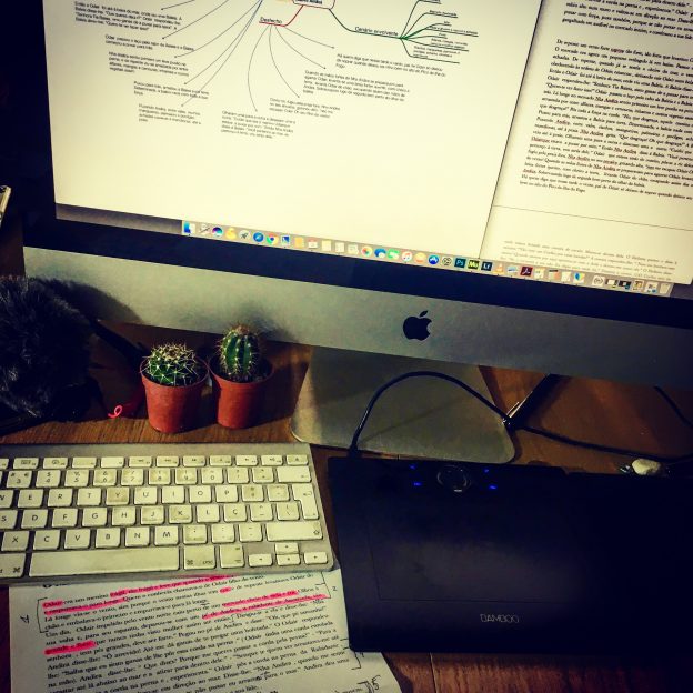 O início de um projeto de ilustração é sempre (para mim) um processo longo de sistematização. O mapas mentais são fundamentais para mim, não só para distribuir os fluxos narrativos, que geralmente divido em quatro (Introdução, Desenvolvimento, Clímax e desfecho) como também para perceber o “todo” da história que pretendo ilustrar.